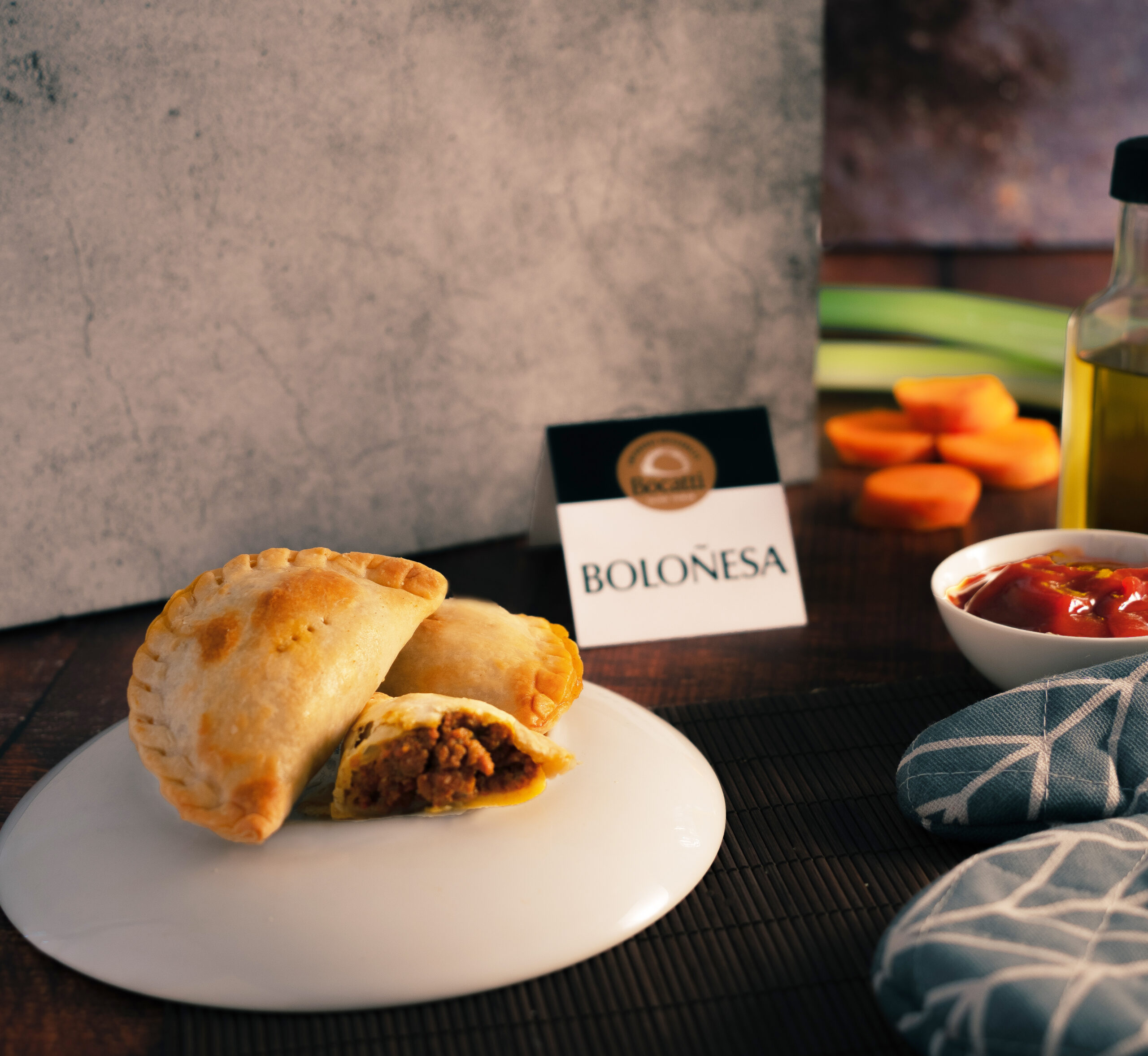 Italia en tu empanada. Una mezcla elaborada con mucho cariño, con carne de ternera, finas tiras de bacon, tomate, cebolla y pimientos lentamente cocinados.